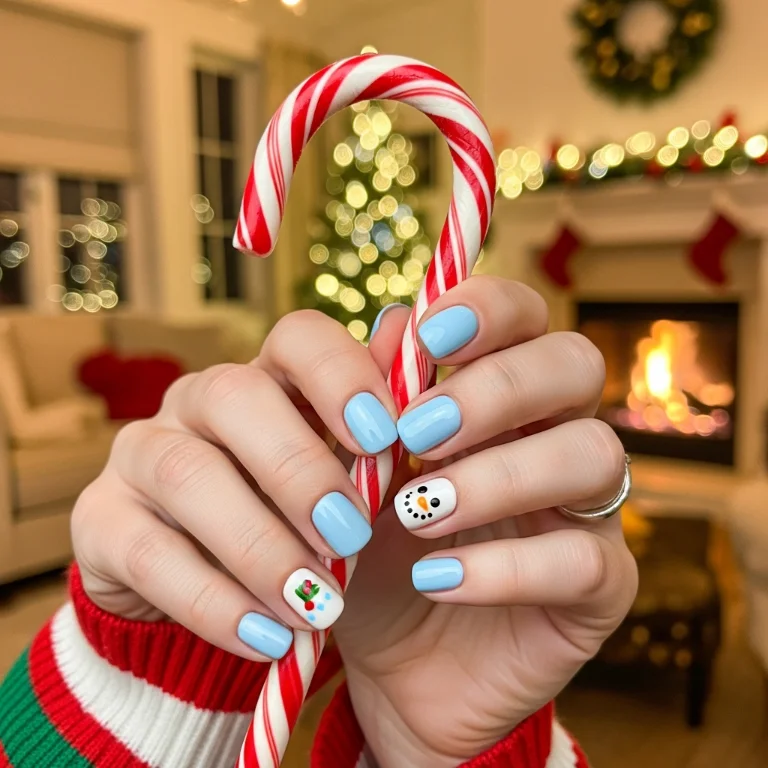 Keep most nails solid white or blue. Paint simple snowman on one accent nail. Add coal dots for face and buttons.