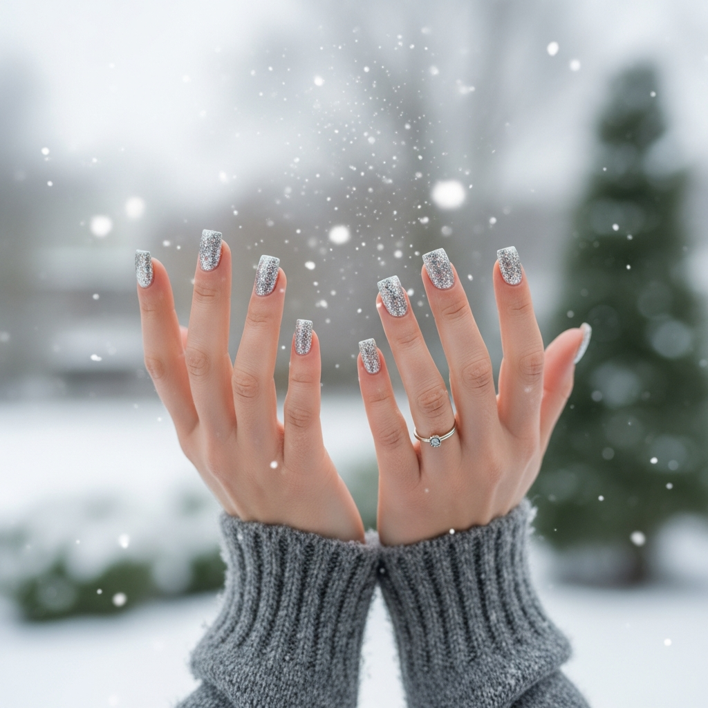 Glitter mimicking sparkling snow creates magic. This nail technique adds shimmer beautifully. The sparkle represents sun on snow.