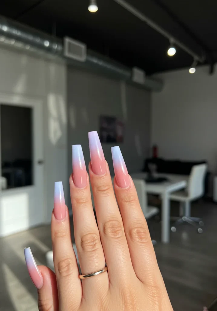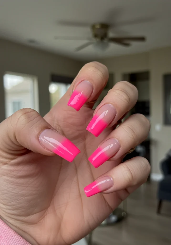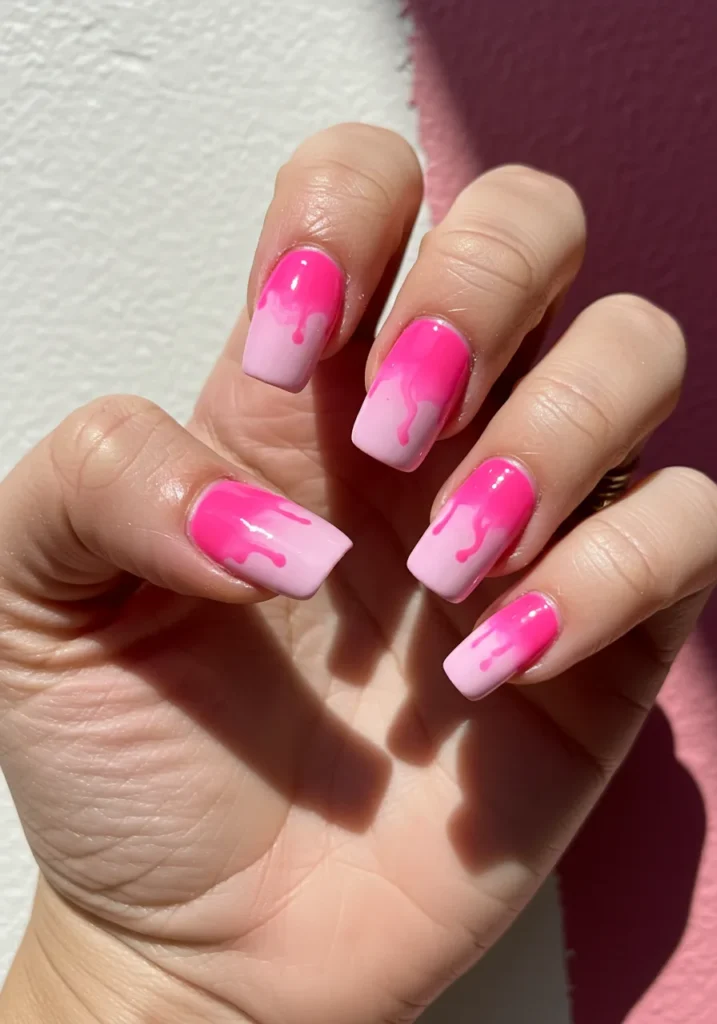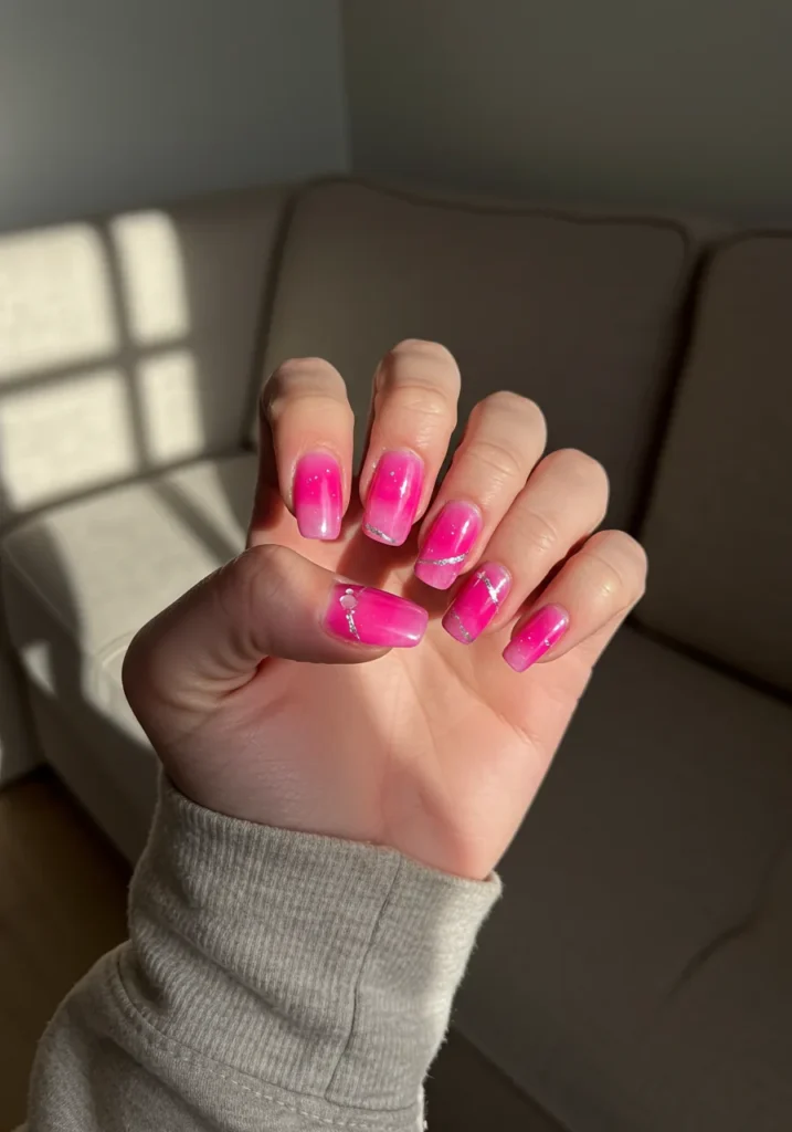 Say hello to fun and bold with this Barbie-inspired gradient. Hot pink flows into a softer shade, combining playful energy with polished elegance. It’s perfect for parties, social media-ready selfies, or casual glam. Blending precisely with a sponge or airbrush and adding a high-gloss finish ensures this manicure pops just right.