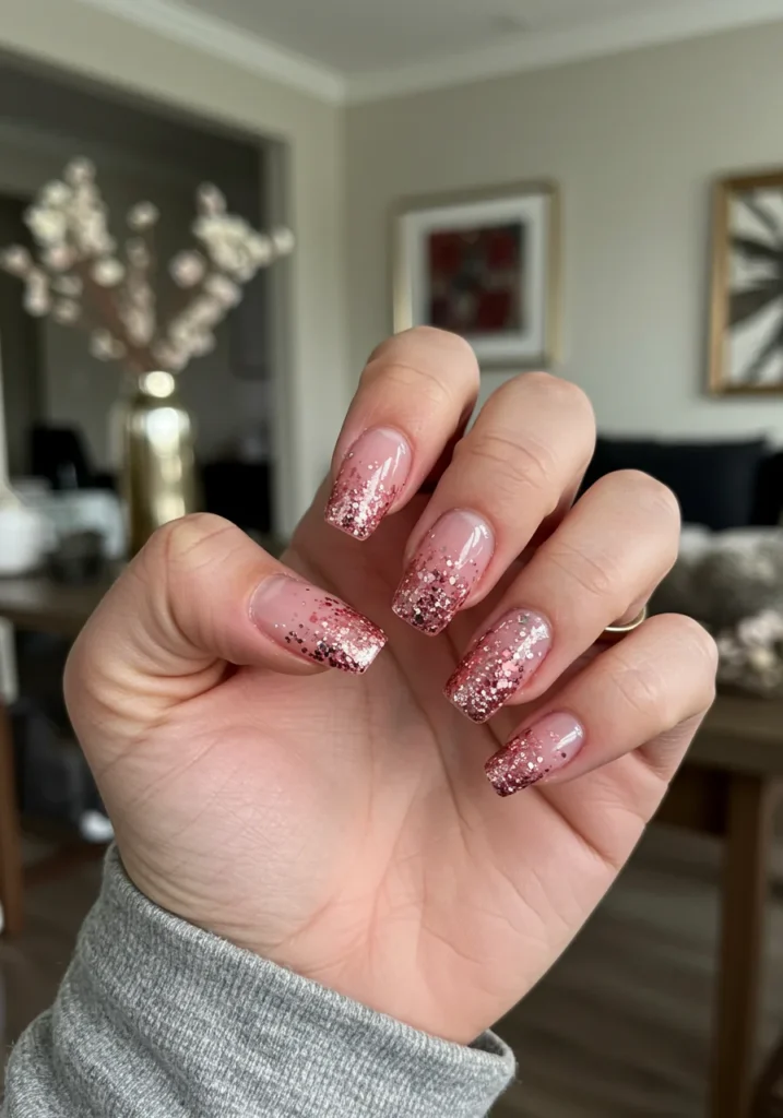 Step into the spotlight with glitter layered over a pink gradient. Silver or rose-gold sparkles fade seamlessly into blushing tips, turning nails into mini fireworks. Ideal for weddings, galas, or nights out, this look balances sparkle with sophistication. For flawless results, apply fine glitter gradually with a sponge, then seal with a glossy topcoat.
