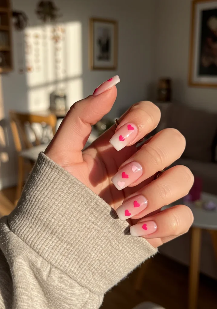Celebrate love with pink ombre nails topped with tiny heart stickers. Sweet and romantic, this style is perfect for Valentine’s Day, anniversaries, or just a daily love reminder. Combine glossy or matte hearts with a protective topcoat for a lasting, charming manicure.