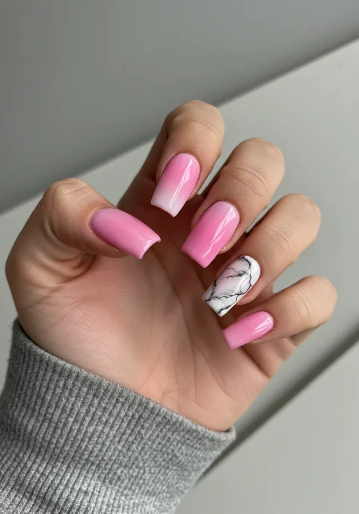 Mix soft pink ombre with chic marble accents for sophistication. One or two nails feature white and gray veining over a neutral base, contrasting beautifully against subtle gradients. This style brings texture and artistry to your fingertips. Achieve it with delicate brushwork, layering, and a touch of creativity—perfect for fashion lovers craving elegance with a twist.