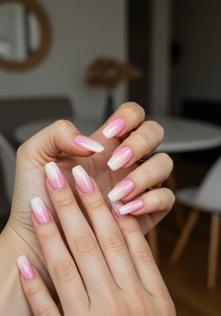 The classic French manicure gets a soft twist with a pink ombre fade. Instead of sharp white tips, sheer blush blends gradually into soft white, creating subtle elegance.