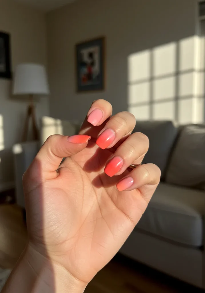 A gentle peach blending into soft pink creates a natural, everyday elegance. Perfect for office wear, casual weekends, or minimalist lovers, this understated ombre is easy to pair with any outfit. Smooth layering and careful blending ensure a flawless transition, making your nails effortlessly chic.