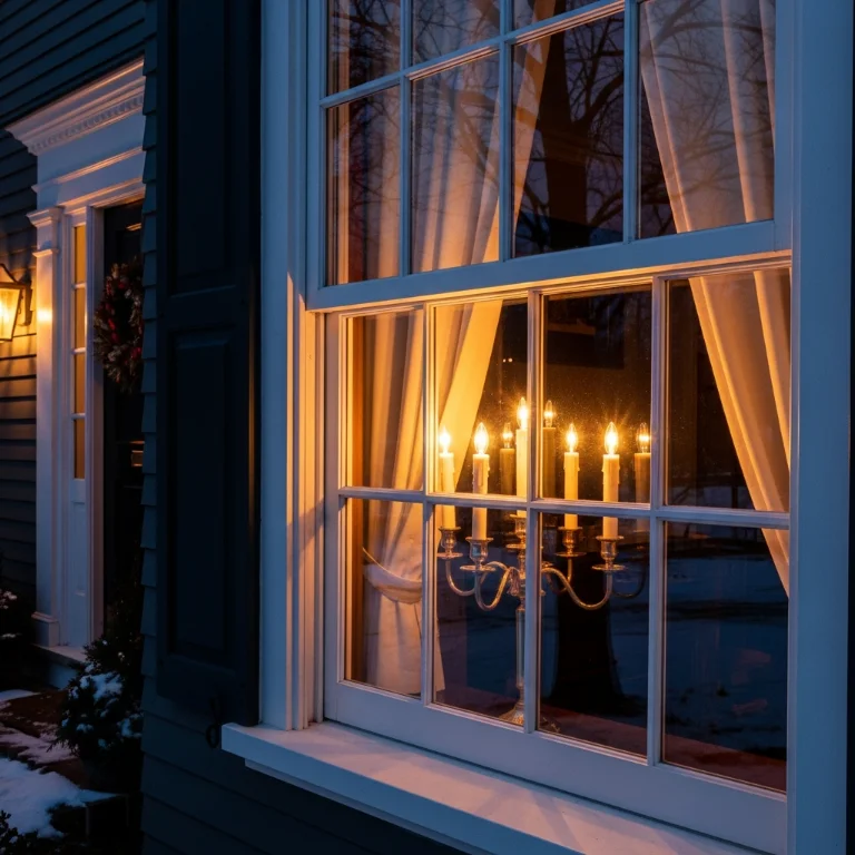 Display vintage brass candolier in front window traditionally. The glowing candles create welcoming retro appearance. Your candle window glows beautifully!