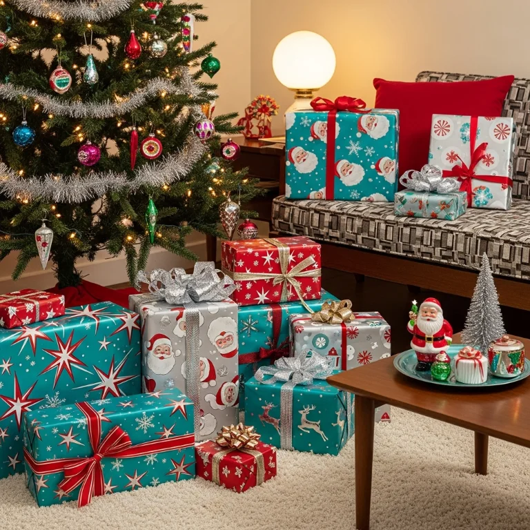 Vintage-inspired patterns create nostalgic gift wrap. This finishing touch completes retro Christmas aesthetic. The paper wraps!