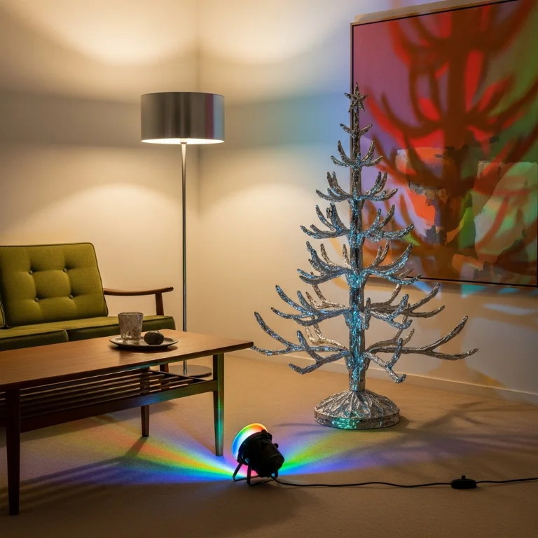 Set up vintage aluminum tree with color wheel spotlight. The rotating colors create classic mid-century display. Your aluminum tree rotates perfectly!