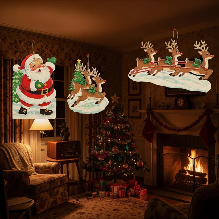 Die-cut Santa and reindeer bring innocent charm. These simple decorations feel genuinely old-fashioned sweet. The cardboard hangs!