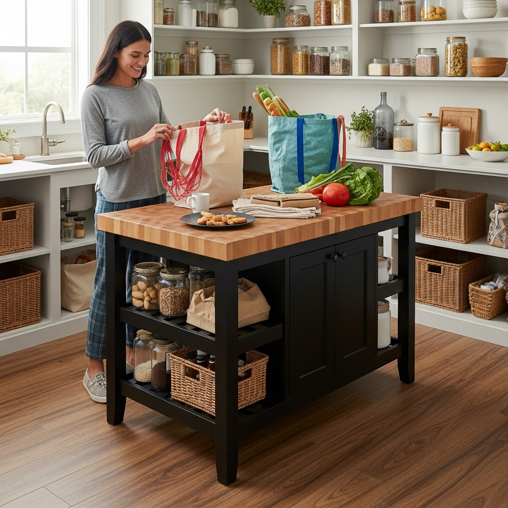 Place butcher block island in pantry center. The additional surface creates folding and sorting area. Your island pantry multitasks beautifully!