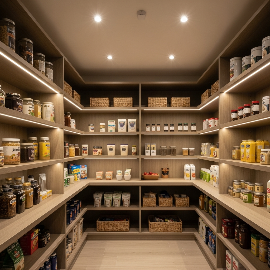 Install LED overhead and under-shelf lights. The layered illumination shows everything clearly. Your lit pantry sees perfectly!