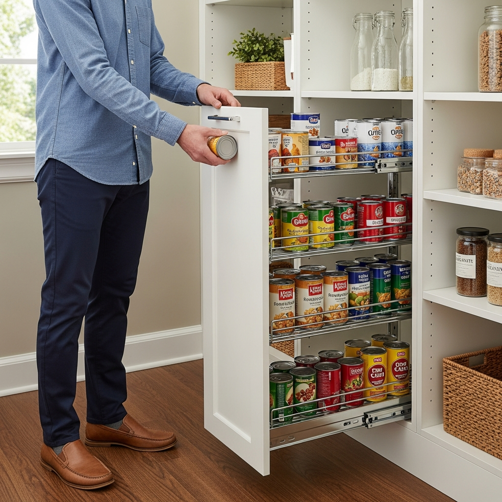 Install rollout shelves in lower sections. The accessible storage uses deep spaces efficiently. Your pull-out pantry wastes nothing!